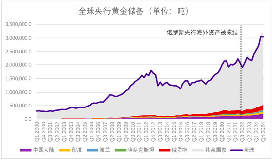 (二)央行购买:全球央行持续大规模囤金行为持续。2025年第一季度全球央行净购金244吨,占比当季黄金总需求的18.6%。其中中国人民银行延续了去年下半年以来的增持趋势,一季度累计购金12.8吨,使官方储备升至2292吨,占外汇储备比重约6.5%。4月末,中国黄金储备达到7377万盎司,已连续六个月增持,近6个月累计增持约28吨。俄罗斯、土耳其等也继续保持购金。自俄罗斯海外央行资产被冻结以来,央行购金需求占比总需求的权重出现持续性抬升,以中国、印度等为首的发展中国家央行开启了连续购金之路。此外,除了中国等央行公布的表内购金数额外,包括中国在内的部分央行也存在表外持续购金的可能性,实际央行购金总量或远大于公布数额。据高盛报告,仅2024年11月单月就有一家央行通过瑞士央行代买了43吨黄金。部分未经披露的央行购金行为也体现出黄金市场的强劲官方买盘。