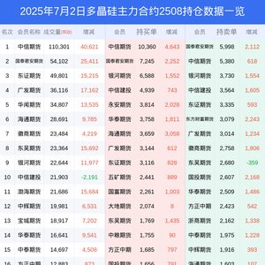 新浪期货 根据交易所数据,截至7月02日收盘主力合约多晶硅2508,涨跌+6.99%,成交量41.16万手,持仓数据显示前20席位呈现净多,差额头寸为11396手。