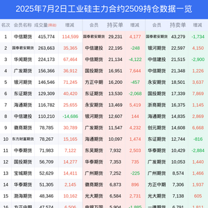 新浪期货 根据交易所数据,截至7月02日收盘主力合约工业硅2509,涨跌+4.79%,成交量164.36万手,持仓数据显示前20席位呈现净空,差额头寸为45874手。