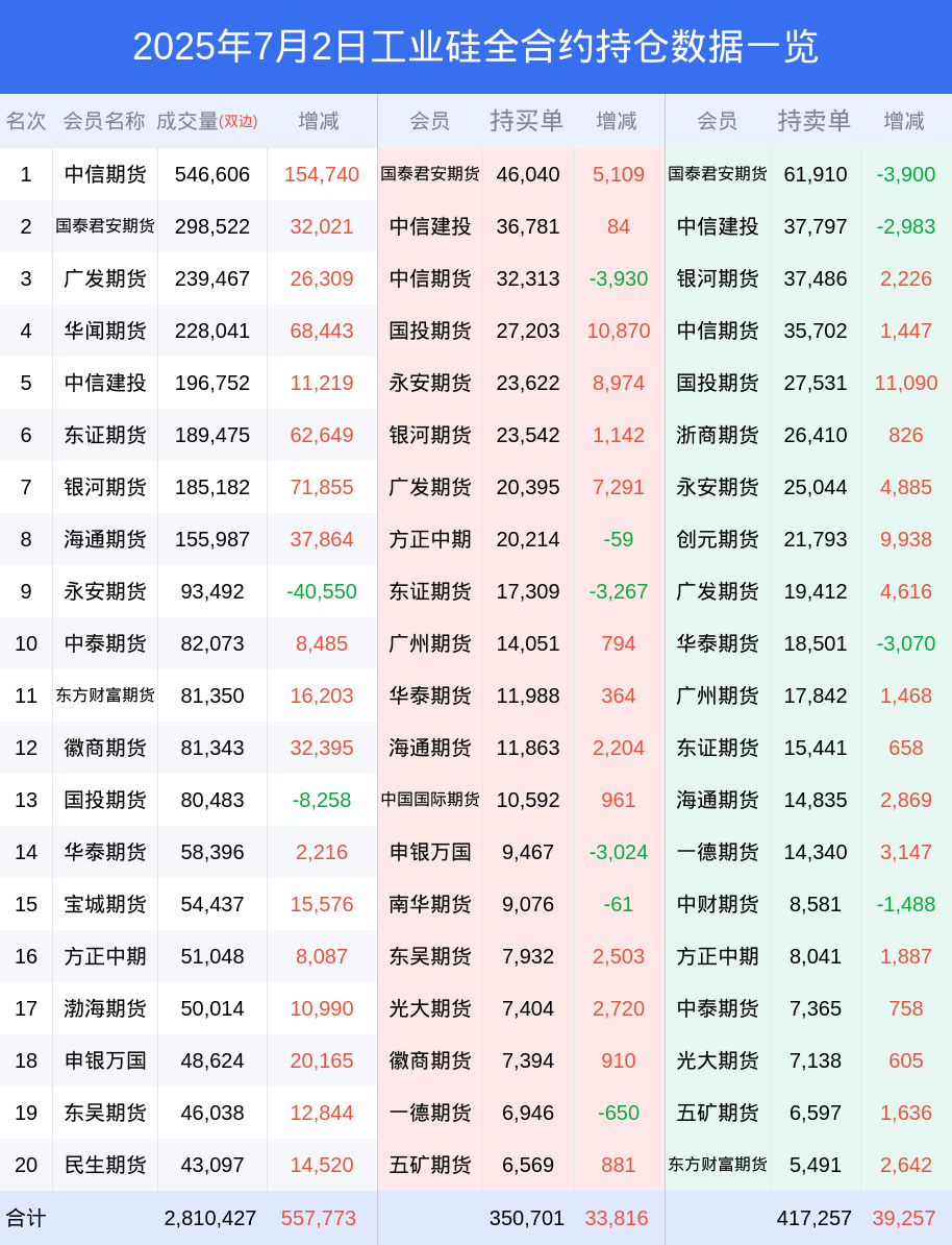 工业硅期货全合约总计成交201.46万手,比上一日新增44.89万手。全合约前20席位多头持仓38.55万手,比上一日增加3.89万手。全合约前20席位空头持仓44.61万手,比上一日增加3.91万手。
