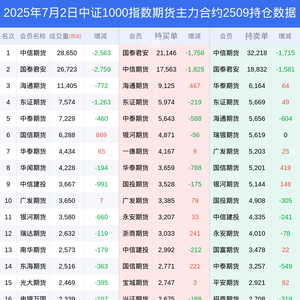 新浪期货 根据交易所数据,截至7月02日收盘主力合约中证1000指数期货2509,涨跌-0.28%,成交量9.34万手,持仓数据显示前20席位呈现净空,差额头寸为18877手。