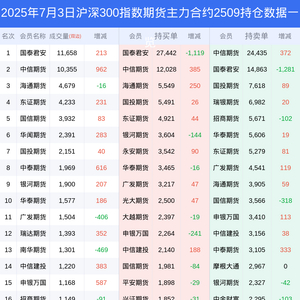 新浪期货 根据交易所数据,截至7月03日收盘主力合约沪深300指数期货2509,涨跌+0.67%,成交量3.81万手,持仓数据显示前20席位呈现净空,差额头寸为15826手。