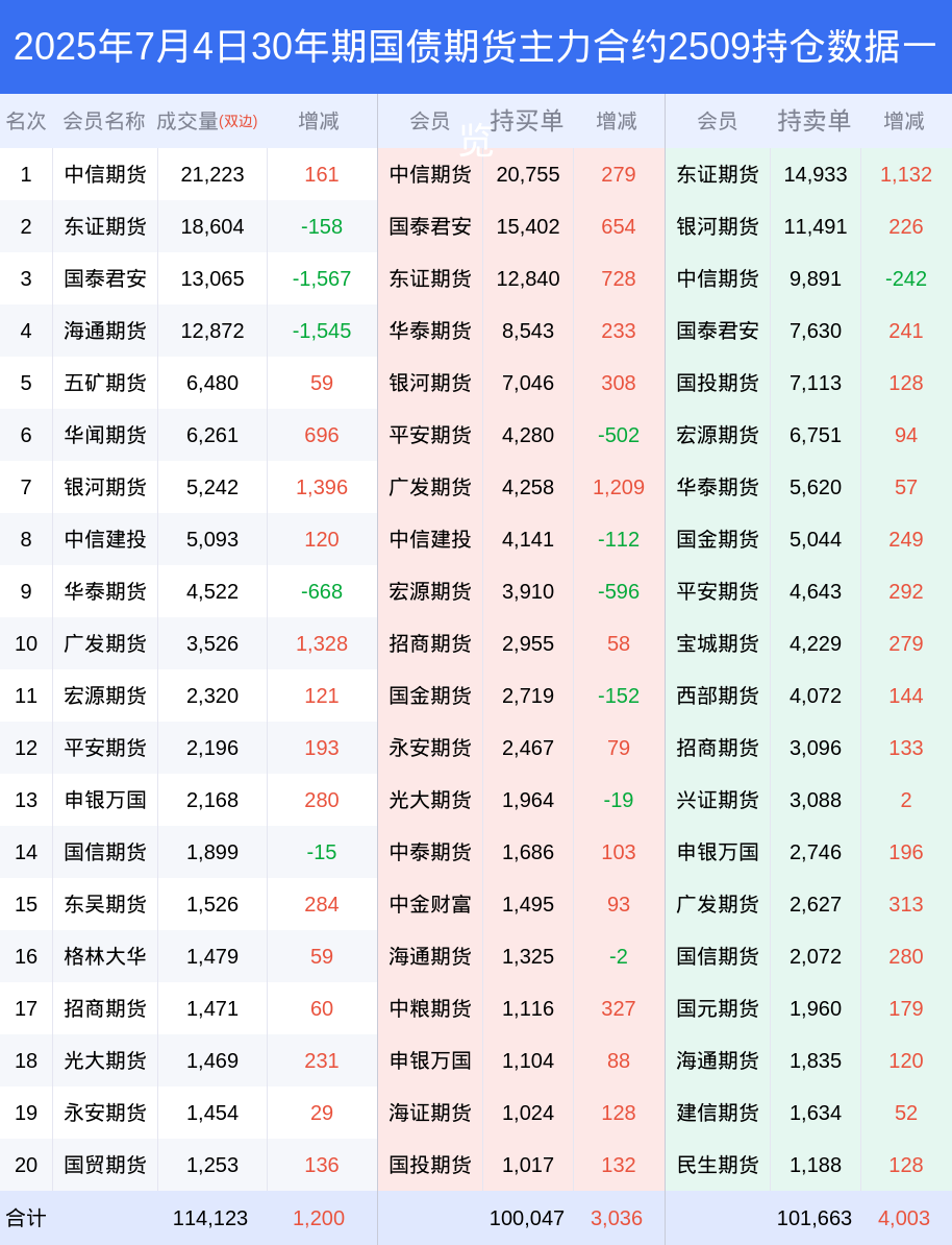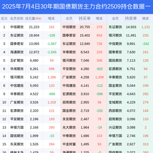 新浪期货 根据交易所数据,截至7月04日收盘主力合约30年期国债期货2509,涨跌+0.11%,成交量7.17万手,持仓数据显示前20席位呈现净空,差额头寸为1616手。