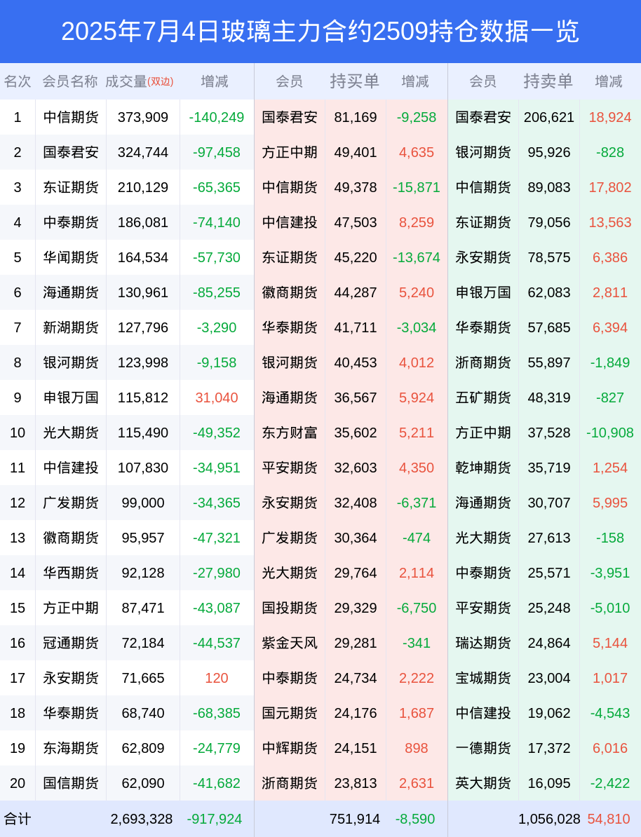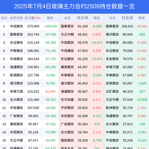 新浪期货 根据交易所数据,截至7月04日收盘主力合约玻璃2509,涨跌-1.54%,成交量223.59万手,持仓数据显示前20席位呈现净空,差额头寸为304114手。