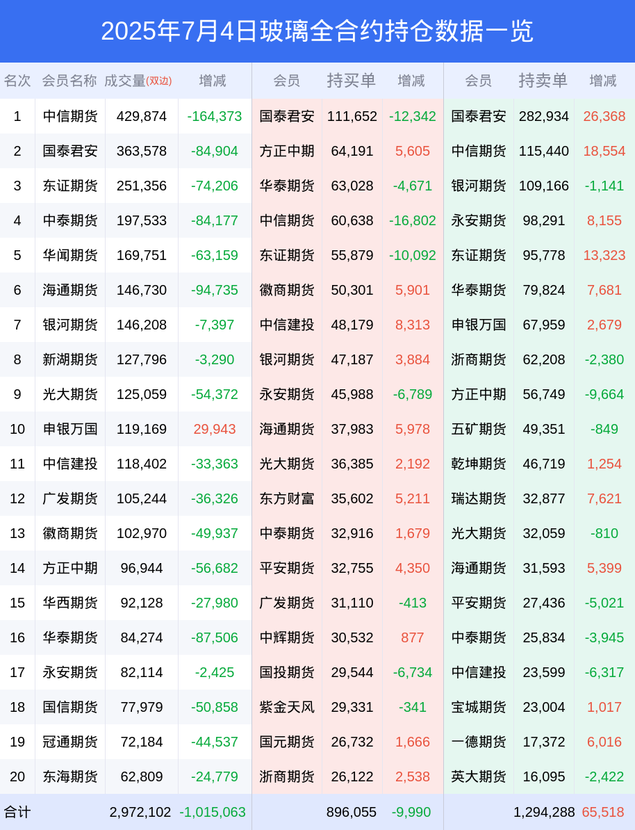 玻璃期货全合约总计成交248.43万手,比上一日减少98.41万手。全合约前20席位多头持仓98.81万手,比上一日减少8812手。全合约前20席位空头持仓134.60万手,比上一日增加6.65万手。