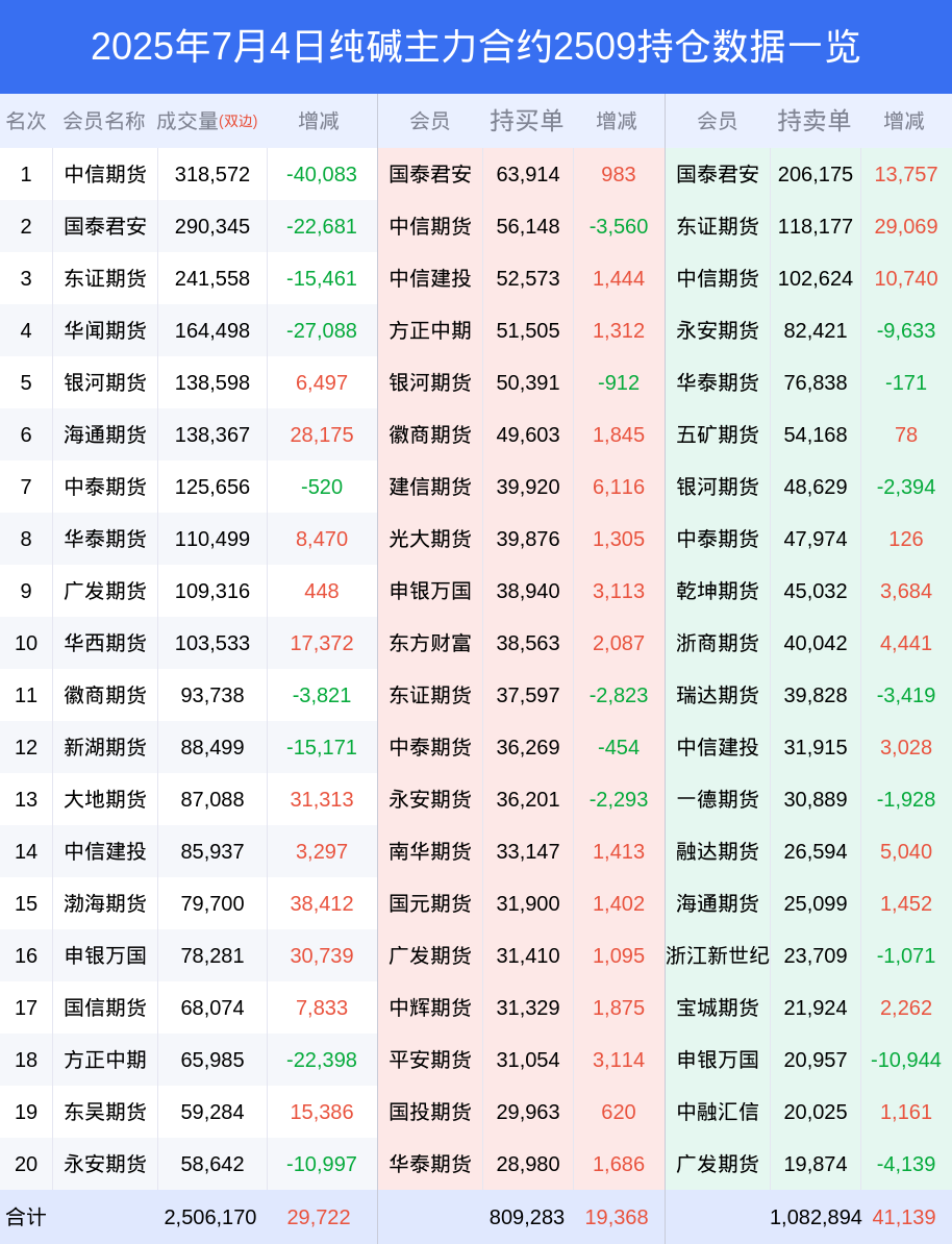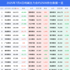 新浪期货 根据交易所数据,截至7月04日收盘主力合约纯碱2509,涨跌-1.18%,成交量213.07万手,持仓数据显示前20席位呈现净空,差额头寸为273611手。