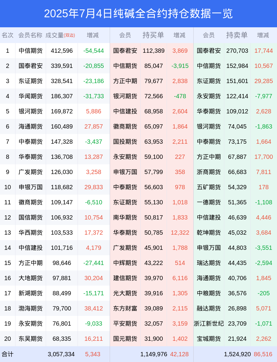 纯碱期货全合约总计成交262.33万手,比上一日减少11.43万手。全合约前20席位多头持仓130.06万手,比上一日增加5.20万手。全合约前20席位空头持仓170.75万手,比上一日增加8.95万手。