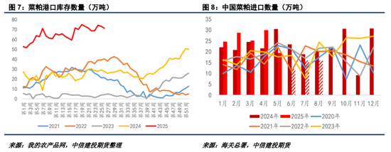 相较于加拿大,国内菜系的现实压力相对显著,目前去库进度较为缓慢。无论是菜油还是菜粕,当前库存均处于历史偏高水平。6-9月本身为水产投料旺季,但菜粕并未得到明显获益,去库不达预期。这主要是因为5-6月期间中国菜籽压榨数量尚可、俄罗斯&印度对华菜粕出口超预期以及国内大豆供应压力等因素共振。从目前船表预测来看,俄罗斯菜粕7-9月来华数量或超出预期,这导致中国菜粕月均进口量仍能维持在15万吨以上。