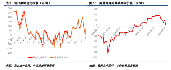 随着07合约逐步临近交割,预计菜系油粕09合约将受到高库存的约束。由于去库不达预期,菜粕交割标准品供应或相对宽裕,供应转紧叙事或进一步推迟到01合约。目前新季供应悬念仍取决于中加经贸谈判进度,产业对远月加菜籽采购仍持谨慎心理。7-9月俄罗斯旧作菜油可售数量已经不多,而菜粕(饼)仍具一定潜力,这可能导致菜粕估值相对承压。菜油方面,参考迪拜菜油下半年船期CNF1140的报价,内盘需突破(9950,10000)区间才能形成套保对锁机会,暂时维持做多菜系01合约油粕比倾向。