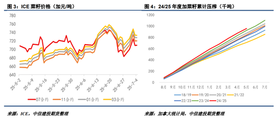 ICE菜籽受美国生物柴油及经贸题材影响,近期出现明显波动,但整体上已经体现出“近弱远强”局面。由于美国生物柴油政策历经几轮反复,虽有需求提振预期,但已经错过加菜籽春播时节,25/26年度加菜籽播种面积同比下降20万公顷至866万公顷。在面积下滑背景下,预计25/26年度加菜籽产量难有明显扩张,叠加需求转好预期,市场对ICE菜籽新季合约持乐观态度。从压榨数据来看,255月加菜籽压榨下滑至83.1万吨,这主要是因为旧作供给偏紧导致的,但24/25年度加菜籽累计压榨仍达到95.9万吨,为历年来最高水平。