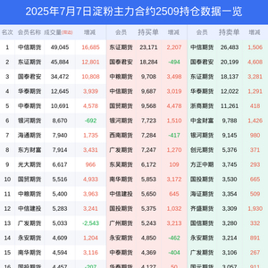 新浪期货 根据交易所数据,截至7月07日收盘主力合约淀粉2509,涨跌-1.72%,成交量16.15万手,持仓数据显示前20席位呈现净空,差额头寸为2707手。