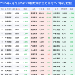 新浪期货 根据交易所数据,截至7月07日收盘主力合约沪深300指数期货2509,涨跌-0.31%,成交量3.58万手,持仓数据显示前20席位呈现净空,差额头寸为16165手。