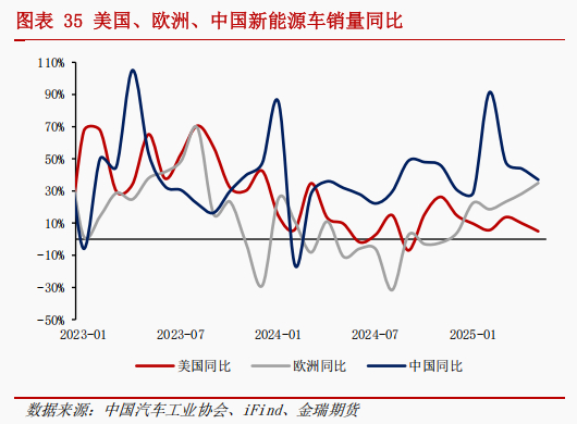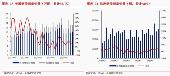 美国新能源车需求面临特朗普任期间的政策不确定性风险,大美丽法案取消新能源购车抵免。美国新能源车1-5月销量达到65万辆,同比+8.9%。7月4日,美国众议院通过《大美丽法案》,该法案确立了广泛的减税措施,同时加大医疗等福利支出削减力度、加快退出风电等新能源补贴。受法案影响,新能源车辆原7500美元的新车补贴和4000美元的二手车补贴将于今年9月30日到期,9月30日前存在窗口期抢购需求,后市美国新能源车增速预期走弱,下半年同比增速预计下滑至5%。