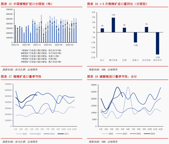锂矿进口方面,今年锂精矿进口表现平稳,1-5月中国锂精矿进口237.8万吨,同比增长4%,其中澳 大利亚锂精矿进口同比+15%,津巴布韦锂精矿同比-22%。津巴布韦精矿进口量大幅下降,或受 Sabi Star 矿山检修停产,以及手抓矿因价格下跌而减少出口影响。