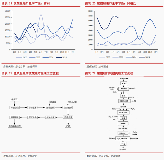 锂盐进口方面,上半年我国南美碳酸锂进口量平稳,智利硫酸锂发运量增长显著,锂资源出口路径调整。1-5月碳酸锂进口量10 万吨,同比增长15%,其中智利进口6.6万吨,同比增长-3%;阿根廷进口2.9 万吨,同比增长 80%。海外锂资源出口路径调整,硫酸锂占比显著提升。2025 年1-5月,智利共发往硫酸锂 3.7万吨至中国,同比增加 131%。与此同时,非洲津巴布韦地区正加速建设硫酸锂冶炼厂,以应对即将 实施的锂精矿出口禁令。作为关键中间产品,硫酸锂既可用于碳酸锂制备,硫酸锂苛化法更是目前工业规 模制取氢氧化锂主流工艺。