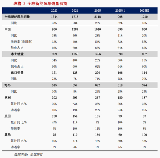 下半年,全球新能源车销量预计达到1210万辆,同比回落至18%;海外市场同比增速23%,欧洲地区贡献主要增量;2025年全年全球新能源车销量预计达到2118万辆,同比23%。