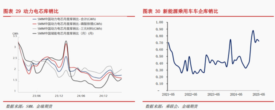 新能源车企库存压力加剧,下半年整车去库动作或削弱对上游原料消费。根据乘联会数据,今年上半年新能源车企库存逐月攀升,折库存天数亦表现出明显抬升。6月中旬,多家车企响应工信部号召,对供应商“支付账期不超过60天”作出承诺。为缩短支付账期,企业或将对成品、原料库存进行控制,放缓提产步伐。与整车库存相比,动力电池库存控制表现尚可,5月三元动力电芯月度库销比2.05,磷酸铁锂动力电芯月度库销比1.65,动力电池总体库销比1.78,库销比水平仅小幅高于去年四季度。