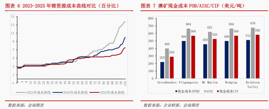 对比2023、2024、2025年的成本曲线,尾部产能成本下降显著,三年曲线的90%分位线对应成本分别为 9.2/7.2/5.7 万元/吨LCE,成本分别下降2和1.5万元/吨LCE,降幅达22%和21%。2024 年年中至今,碳酸锂期货主联价格自9.5 万元/吨下降至 6万元/吨,降幅达3.5 万元/吨,可见除成本因素外,供需以及 过剩预期主导了接近2万元/吨的跌价。