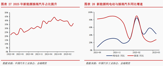 2025年1-5月,新能源汽车产销分别完成570万辆和561万辆,同比分别增长45%和44%,渗透率达到44%。销量结构上,今年纯电车型贡献较高增速。1-5月,纯电动乘用汽车增速49%,插混增速36%,五月插混占比36%。作为对比,2024年全年纯电动汽车同比增速16%,而插混车型同比高达84%。