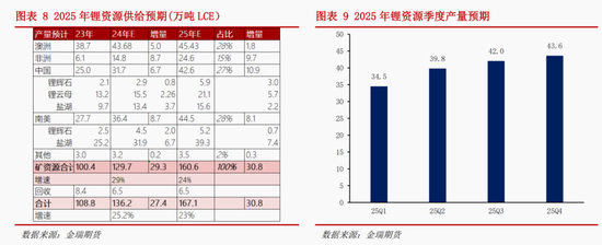2025年锂资源供给预计达到167万吨,同比增长23%,其中原生锂资源合计160.6万吨,增量30.8万吨,增量30.8万吨,增量主要来自非洲、中国、南美地区。今年一季度的项目进度偏缓,产量占全年21%,部分盐湖产能 建设进度延期,部分新矿石产能处于爬产进程中。