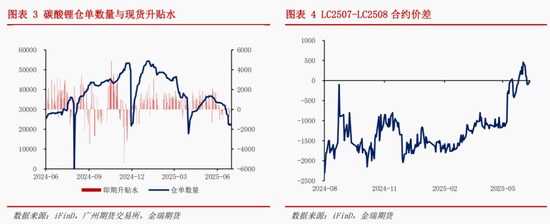 年初至今现货价格持续对盘面升水,仓单量明显下降,现货情绪好转。市场买交割需求上升,碳酸锂仓单由年初 5.4 万手下降至 7 月初的 2.1 万手。集中交割月所在的前后两个合约(LC2507与LC2508)之间 价差明显收窄,反映仓单集中注销对市场的冲击衰减,市场对交割品的买交割意愿上升。结构上看,6 月中旬碳酸锂期货由原本 contango 结构向back 结构转变,现货情绪好转。