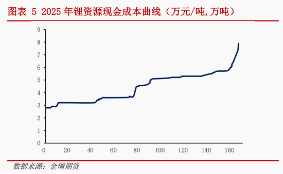 2025年,锂资源成本曲线重心进一步下移,矿石提锂的成本下降显著,目前 95%/90%/85%产能分线分别对应锂资源成本 5.9/5.7/5.4 万元/吨 LCE。其中5-6万区间产能较多,占总产能的 35%。