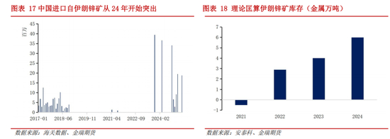 值得注意的是,自去年开始国内对伊朗进口锌矿增加,其中2024年总计输入国内8万实物吨,2025年年初迄今总计输入国内4.75万实物吨。根据安泰科数据,匡算伊朗自身锌矿供应及需求量级发现,2024-2025年间其国内结余锌矿库存已大半输入国内。