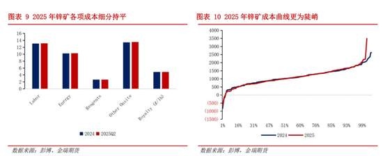 从样本内数据看,锌矿生产运行各项成本保持平稳,平均C1成本与2024年基本保持一致。值得注意的是,2025年成本曲线尾部较为陡峭,尤其是位于尾部100%、99%的项目。这些项目中,有部分项目属于2023年锌矿价格较低时出现的关停项目,经过2024年的价格刺激而复产。