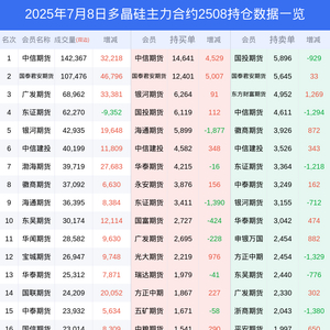 新浪期货 根据交易所数据,截至7月08日收盘主力合约多晶硅2508,涨跌+7.00%,成交量63.44万手,持仓数据显示前20席位呈现净多,差额头寸为19232手。