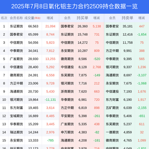 新浪期货 根据交易所数据,截至7月08日收盘主力合约氧化铝2509,涨跌+2.78%,成交量44.00万手,持仓数据显示前20席位呈现净空,差额头寸为4040手。