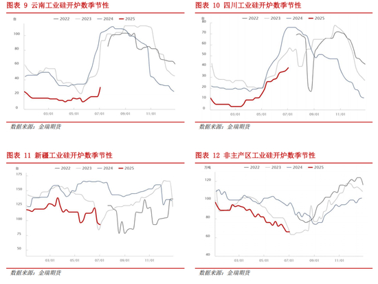 上半年,受硅价跌破成本线影响,供给端开工受到明显抑制,当前行业开工率仅31%。1-6月工业硅产量约185万吨,同比下降19%。分地区看,新疆地区开工平稳但六月末大厂突发集中减产;四川受益于丰水期及多晶硅配套产能复产,贡献边际增量;云南则因小厂集中且利润承压,复产进度持续滞后;非主产区与西南产区形成季节性互补,普遍采取“丰水期减产、枯水期复产”的开工策略。从复产弹性来看,当盘面价格突破8500元/吨关口时,西南地区开工意愿修复;突破9000元/吨关口时,西南开工率有望获得实质性改善。