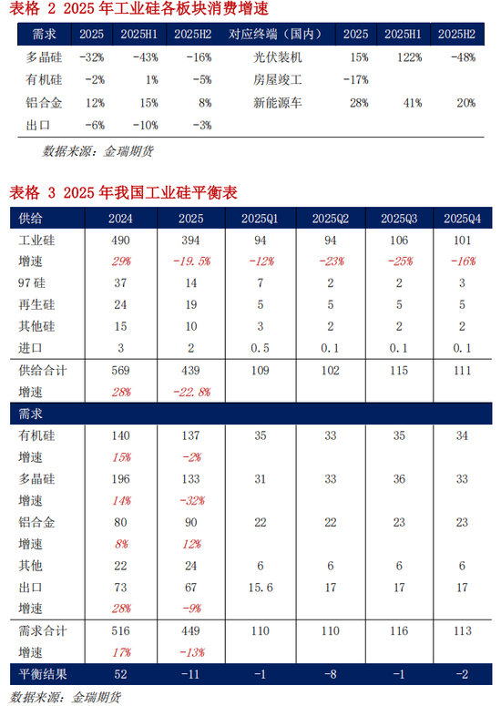 硅价低迷,高成本产能开工率下降,西南产区三季度产量或仅为 2024 年西南三季度产量的 50%,下 半年工业硅产量预计达 207 万吨,同比-21%;全年工业硅产量 394 万吨,同比-20%。