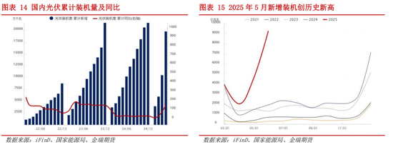 新政落地催生分布式光伏“抢装潮”,行业从“政策驱动”转向“市场驱动”,三季度分布式光伏需求前置。年初,国家发改委、国家能源局联合发布《分布式光伏发电开发建设管理办法》、《关于深化新能源上网电价市场化改革 促进新能源高质量发展的通知》。政策规定,4月30日前并网的工商业分布式光伏可以全额上网,且锁定原有补贴或电价政策红利;5月31日前并网的项目能享受保障性电价政策,各省自主确定享受保障性电价的比例;5月31日之后的增量项目全面入市,必须通过电力现货市场交易消纳,不再享受补贴。国家能源局数据显示,今年1-5月国内新增光伏装机198GW,同比150%,其中5月新增光伏装机93GW,同比388%,单月新增装机创历史新高。