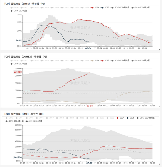 我觉得在宏观明确之前,铜会被关税带来的扰动影响,大家会思考库存的腾挪和回流,需求的前置和后移,等到宏观明确,那么又要多一个影响因素,我一向觉得宏观带来的方向是凌驾价差交易的。在今年的话,这句话的意思更多是,三个交易所之间的库存腾挪,并不影响三个交易所加总库存的变化方向。只是现在大家没有宏观方向,所以价差交易会更吸引眼球。