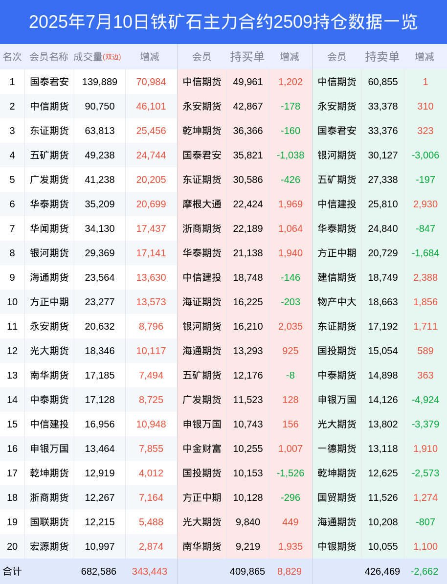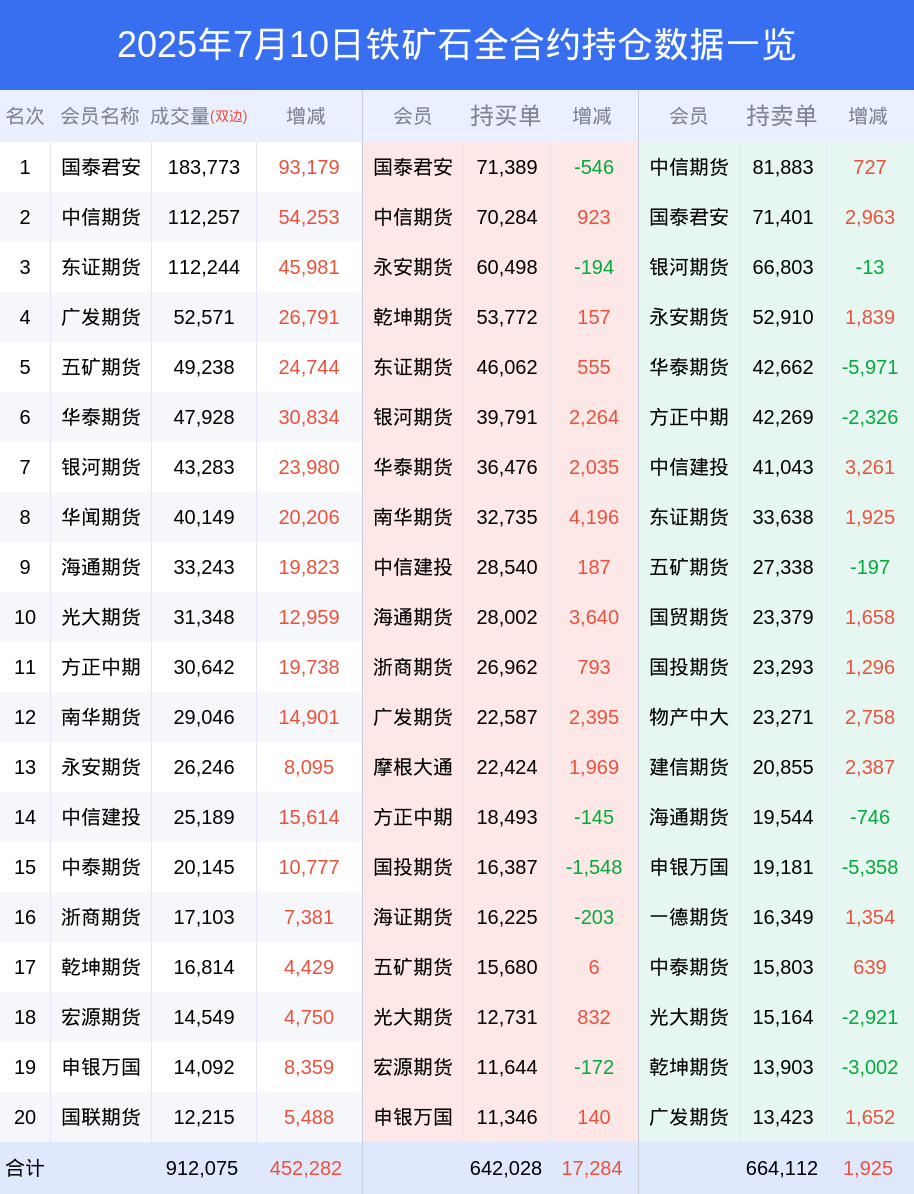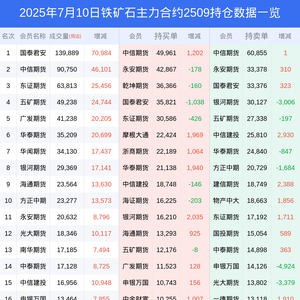 新浪期货 根据交易所数据,截至7月10日收盘主力合约铁矿石2509,涨跌+3.67%,成交量51.41万手,持仓数据显示前20席位呈现净空,差额头寸为16604手。