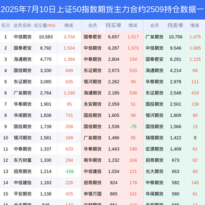 新浪期货 根据交易所数据,截至7月10日收盘主力合约上证50指数期货2509,涨跌+0.49%,成交量3.37万手,持仓数据显示前20席位呈现净空,差额头寸为10735手。