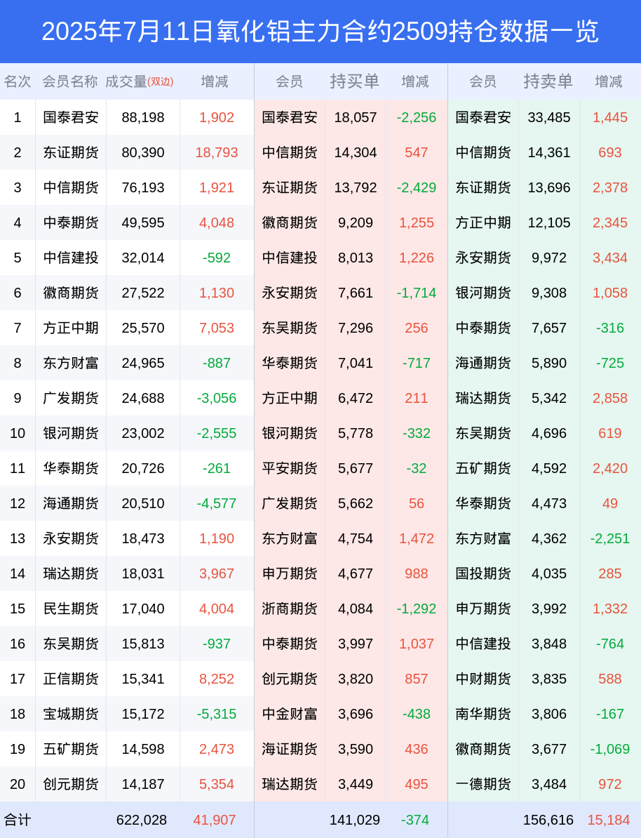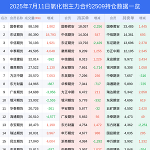新浪期货 根据交易所数据,截至7月11日收盘主力合约氧化铝2509,涨跌-2.44%,成交量54.57万手,持仓数据显示前20席位呈现净空,差额头寸为15587手。