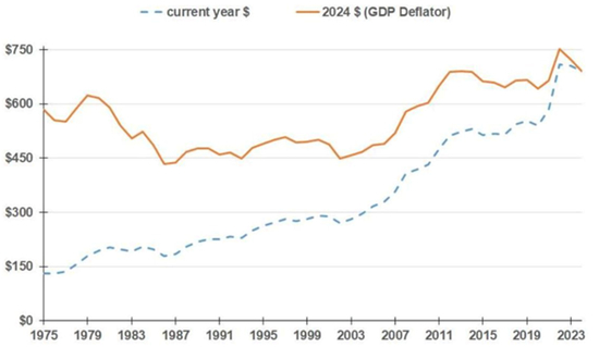 自2000年以来,这九种生产成本作物每公吨的实际综合成本在20世纪70年代末/80年代初从每公吨 $500下降后,一直围绕每公吨 $300波动。2024年的实际综合成本估计为每公吨$300,比1999年后每公吨$303的平均水平低 $3。大体上看,基于美国种业产出效率的提升,目前每单位产出的实际综合成本并非处于历史高位。