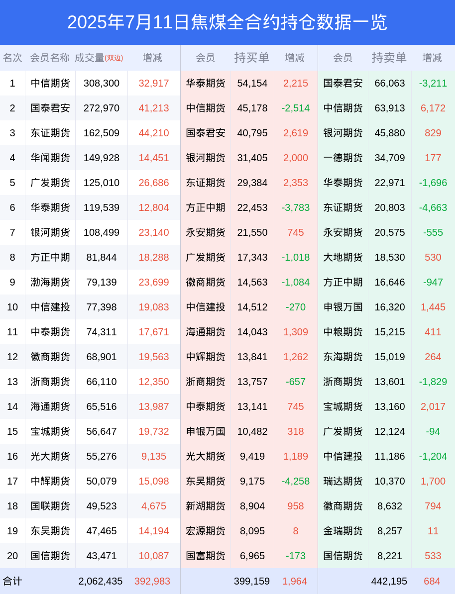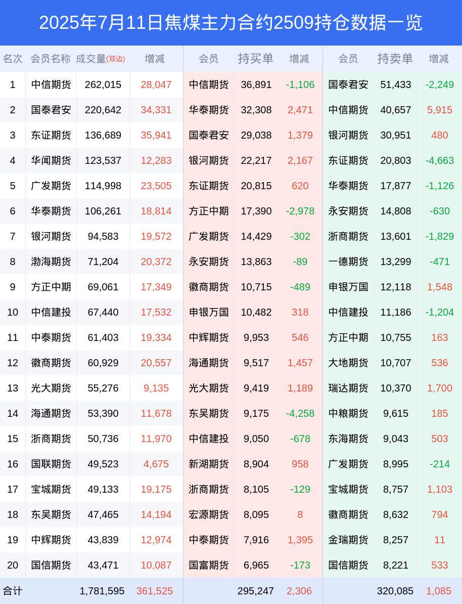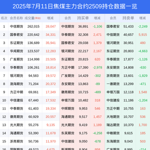 新浪期货 根据交易所数据,截至7月11日收盘主力合约焦煤2509,涨跌+3.34%,成交量145.61万手,持仓数据显示前20席位呈现净空,差额头寸为24838手。