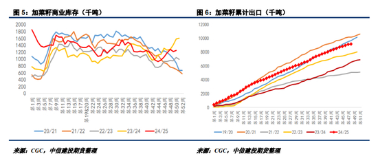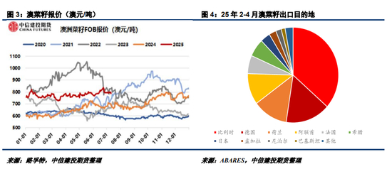 受澳大利亚领导人访问中国信息刺激,市场预期中加有望在农产品方面获得贸易上的突破,澳菜籽杂质问题有望获得放宽。市场预期部分企业将获得澳菜籽进口试点机会,如果后期相关贸易限制放宽,中国菜籽进口来源将呈现多元化特征。不过,24年12月至25年4月,澳菜籽累计出口已经达到366万吨,其旧作可售数量已经比较有限,澳菜籽对华出口潜力将更多体现在2026年以后。