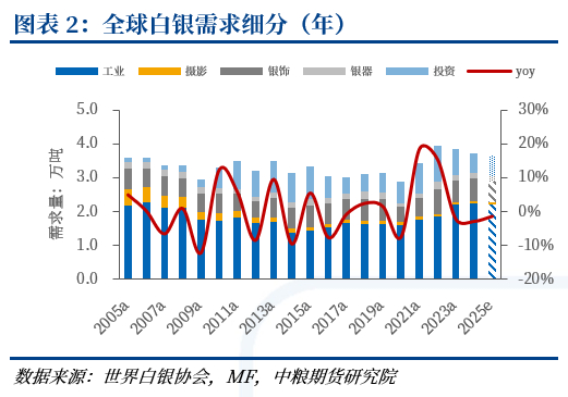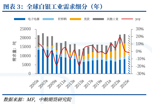 2024年,全球白银实物需求(不含ETF)预计为3.72万吨,同比下降3.1%。其中,工业需求为2.23万吨(同比+1.7%),银饰需求0.649万吨(同比+2.76%),银器需求0.169万吨(同比-1.63%),投资需求0.594万吨(同比-21.86%)。展望2025年,全球白银实物需求预计为3.66万吨,同比下降1.6%。关键应用领域需求预测如下:光伏用银需求约0.7万吨;以电子电器和钎焊料为代表的半导体相关白银需求预计约为1.04万吨。