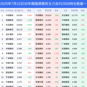 新浪期货 根据交易所数据,截至7月15日收盘主力合约30年期国债期货2509,涨跌+0.47%,成交量9.13万手,持仓数据显示前20席位呈现净空,差额头寸为556手。