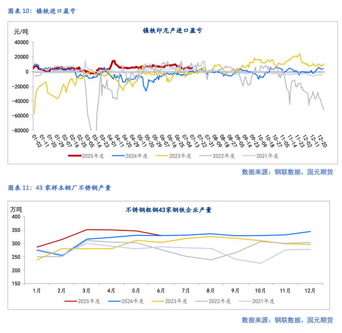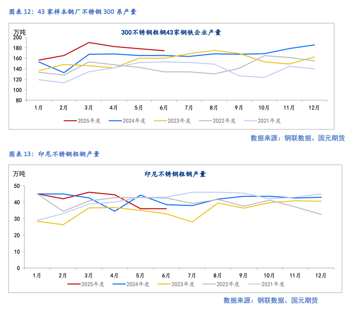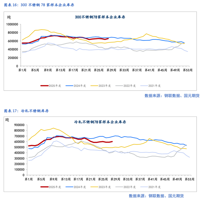 供应方面,排产延续下降,其中冷轧排产增加。据Mysteel统计,2025年6月国内43家不锈钢厂粗钢产量329.16万吨,月环比减少17.13万吨,其中:200系98.93万吨,月环比增加1.32万吨,同比减少3.53%;300系174.4万吨,月环比减少4.07万吨,同比增加5.5%;400系55.83万吨,月环比减少14.38万吨,同比减少8.48%。7月排产326.8万吨,月环比减少0.72%,同比减少1.22%,其中:200系97.4万吨,月环比减少1.55%,同比减少3.58%;300系173.15万吨,月环比减少0.72%,同比增加5.84%;400系56.25万吨,月环比增加0.75%,同比减少15.04%。