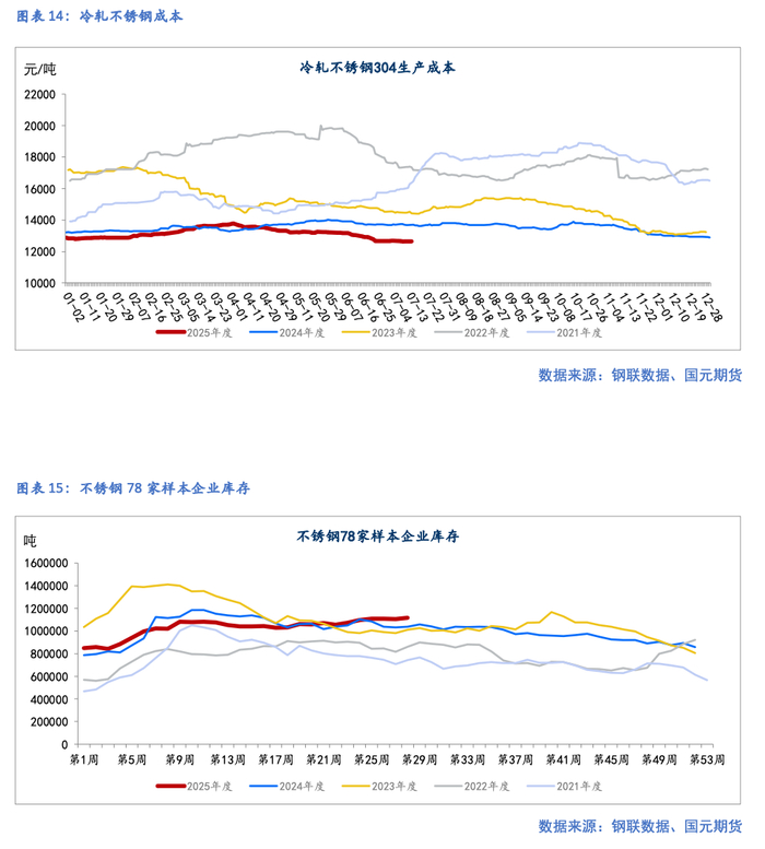 库存累库至高位,需求预期偏弱。7月10日,全国主流市场不锈钢89仓库口径社会总库存116.75万吨,周环比上升0.93%。其中冷轧不锈钢库存总量63.72万吨,周环比上升1.86%,热轧不锈钢库存总量53.03万吨,周环比下降0.17%。下游需求有限,采购偏谨慎,整体消化节奏较为缓慢。据产业在线最新发布的三大白电排产报告显示,2025年7月空冰洗排产合计总量共计2960万台,较去年同期生产实绩下降2.6%。