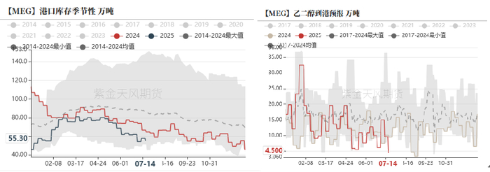 • 截止7月7日,华东主港地区MEG港口库存约55.3万吨,环比下降2.7万吨。当前库存处于偏低水平。