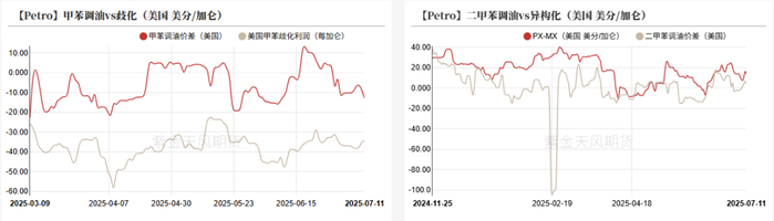 • 美亚套利价差走扩,甲苯美亚价差238元,二甲苯美亚价差146美元,美对日韩关税预期上调至25%,考虑关税后价差空间不大。