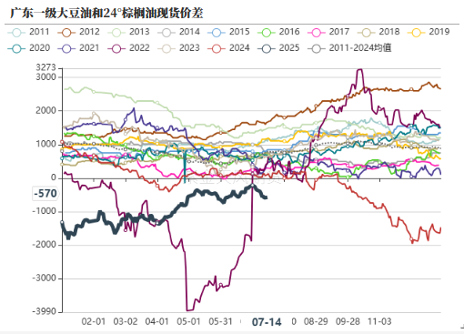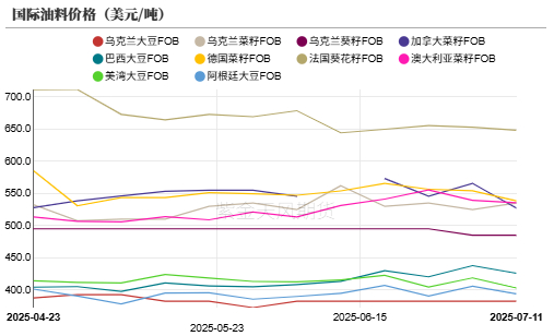 • 截至2025年7月11日,周度南北美豆油价格走弱,但是国际棕榈油价格上涨。