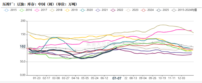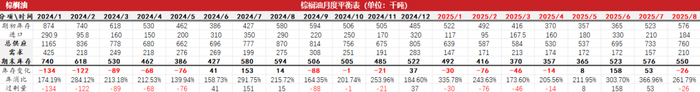 因为6月工作日少,马来西亚棕榈油产量出现下降,减幅高于历史平均水平,其中沙巴州减产幅度最大,6月沙巴州降水偏多。6月印尼棕榈油出口关税从上月的143美元/吨下降至137美元/吨,造成6月马印精炼棕榈油价差缩小,另外由于消费国印度出现船运拥堵情况,而印度又在6月中下旬洗船较多,造成6月马来西亚棕榈油出口下降,这一点从6月的进口数据也能看出,并和船运商检机构数据形成较大的差距。6月马来西亚棕榈油表观消费量再度回到40万吨以上,从季节性来看,6月消费本该下降的,反季节性的上升可能是将毛棕榈油加工成其他品类进行出口,最终6月底库存略高于市场预估。进入7月,工作日天数多,产量将会有较大的环比增幅,而高频的船运商检数据看出,出口有所放缓,但是考虑到8月印尼可能提高出口关税,最终出口表现还要继续关注,继6月印度进口较多的棕榈油,据了解,7月进口量可能更多,截至7月14日,印度港口豆棕价差虽然回落,但还是在70美金以上。