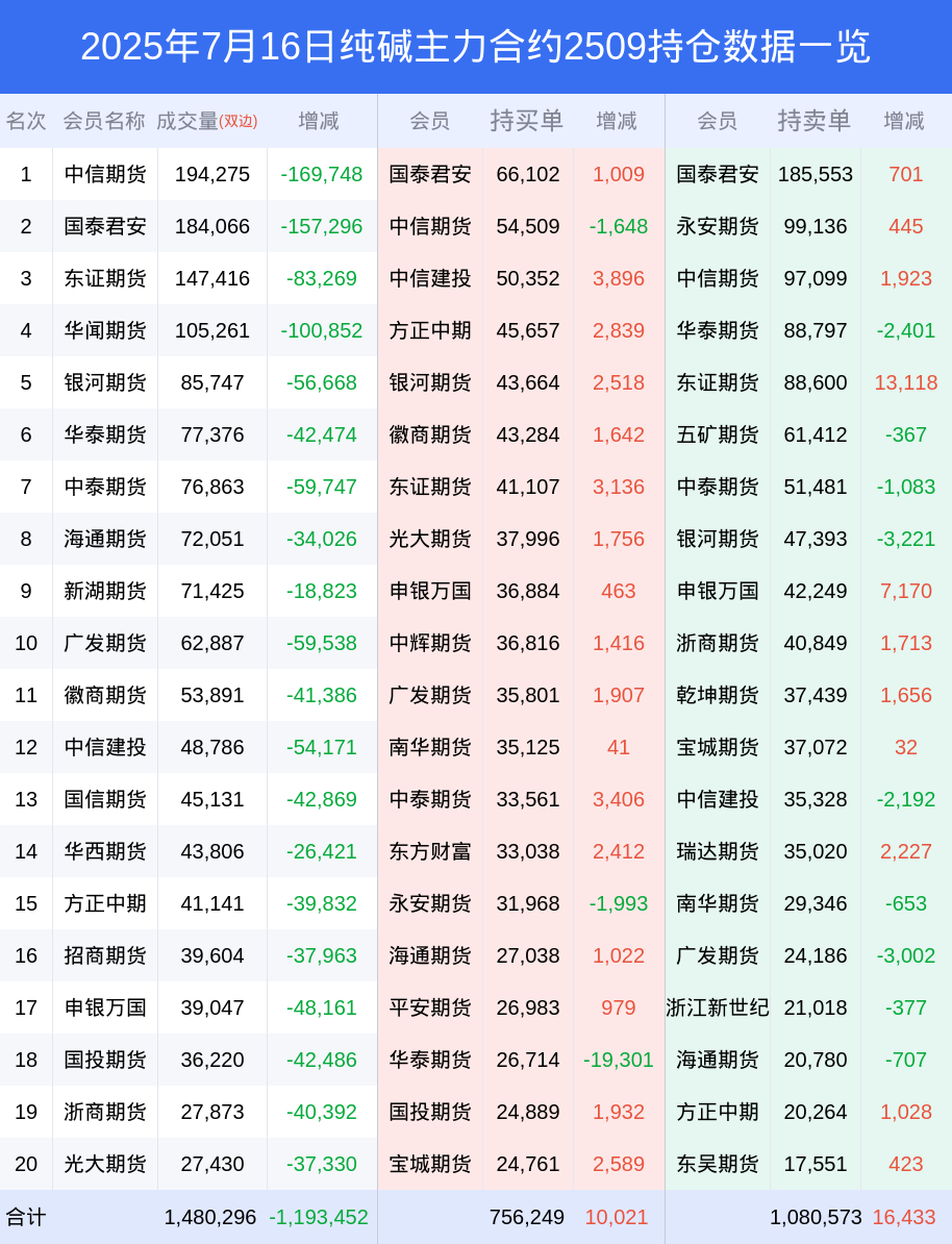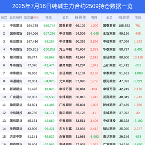 新浪期货 根据交易所数据,截至7月16日收盘主力合约纯碱2509,涨跌-1.47%,成交量117.58万手,持仓数据显示前20席位呈现净空,差额头寸为324324手。