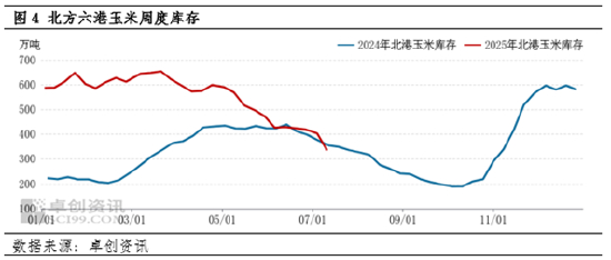 虽然进口玉米拍卖从一定程度补充了市场供应,但一周两次总量约60万吨的进口玉米拍卖,对目前玉米市场基本面的影响还是有限的,其中对东南沿海的影响更低,截至7月11日的拍卖数据,每周拍卖涉及南方沿海省份的投放量约17万吨,此数量远低于南方沿海下游消费,若再考虑其质量与成交率,影响更是微乎其微,更多体现在心态层面的影响。而作为南方沿海的主要货源供应来源,南北港口的库存目前处于持续下降的趋势,从图4中可以看出,北方港口库存自二季度开始就处于缓慢下行阶段,截至7月11日,北方六个主要玉米贸易港口的库存总量约335万吨,已低于去年同期水平。而南港因贸易活跃度较低,贸易商运作也较为谨慎,主要执行合同订单,中间市场库存量同样逐步减少,截至7月10日,广东粤东港区玉米内外贸库存总量约88.9万吨,其中内贸库存87.1万吨,可售现货占比不足30%。
